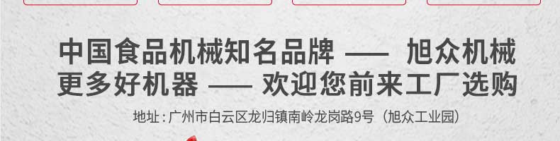 广州旭众食品机械有限公司是一家集科研开发,生产设计,营销服务为一体的现代化生产企业。现代化生产车间,精湛制造技术,所产机械历经市场重重考验,不断赢得海内外客户的赞誉。