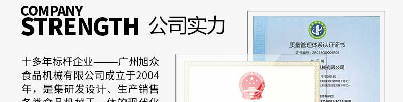 广州旭众食品机械有限公司是一家集科研开发,生产设计,营销服务为一体的现代化生产企业。现代化生产车间,精湛制造技术,所产机械历经市场重重考验,不断赢得海内外客户的赞誉。