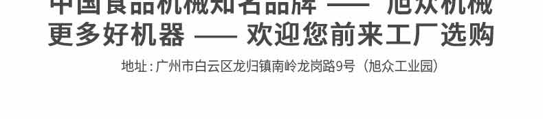 广州旭众食品机械有限公司是一家集科研开发,生产设计,营销服务为一体的现代化生产企业。现代化生产车间,精湛制造技术,所产机械历经市场重重考验,不断赢得海内外客户的赞誉。
